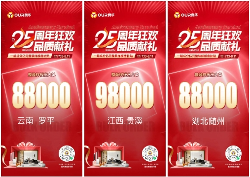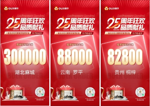 奧華全國各終端專賣店結合自身實際情況,通過多種活動素材裝飾相結合,打造25周年狂歡活動氛圍,讓消費者更直觀的感受到奧華25周年狂歡活動的魅力。